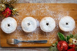 Strona główna » Świąteczne ciasteczka pora piec! » Weihnachtliche Mince Pies auf Holzbrett von oben gesehen