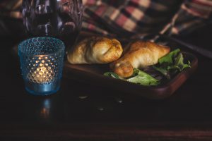 Strona główna » Coś na ząb! » Two lamb stuffed empanadas and a glass of red local wine in a patagonia argentina chic retreat.