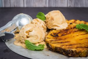 Strona główna » Grillowany ananas z lodami i rumem » Grilled pineapple with vanilla ice cream and mint leaves