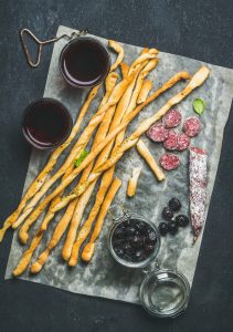 Strona główna » Grissini na sylwestra » Italian Grissini, pork sausage, olives, red wine over dark background