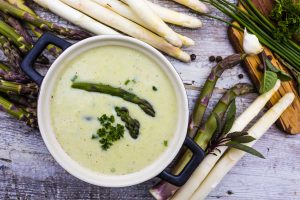 Strona główna » Krem ze szparagów z miętowym pesto » Delicious creamy asparagus soup on a wooden background.