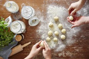 Strona główna » Kulki z nadzieniem robione we dwoje;-) » two people kneading dough bakig together wooden trable