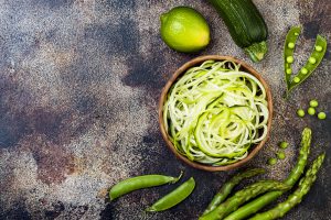 Strona główna » Ostre jak brzytwa spaghetti z cukinii! » Zucchini spaghetti or noodles (zoodles) bowl with green veggies. Top view, overhead, copy space
