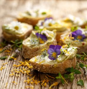 Strona główna » Pięknie podane » Canapes with eddible flowers and broad bean hummus on a wooden table