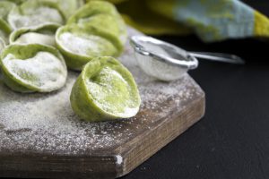 Strona główna » Pierożki z warzywnymi pastami Helcom Naturalnie! » Dumplings green on a black background in flour.