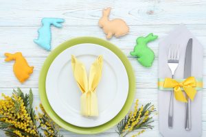 Strona główna » Serwetka zajączek na Wielkanoc » Kitchen cutlery with easter fabric rabbits and mimosa flowers on wooden table
