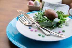 Strona główna » Wielkanocne inspiracje – czekoladowe cuda » Beautiful Easter table settings, white and blue plate, silver cutlery, decorative nest with chocolate egg and colorful candy on wooden background. Happy Easter concept.