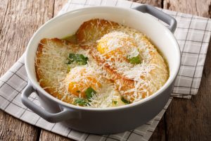 Strona główna » Zupa czosnkowa z serem żółtym i grzankami » Baked Pawese soup with toast, eggs and parmesan in a saucepan. Horizontal